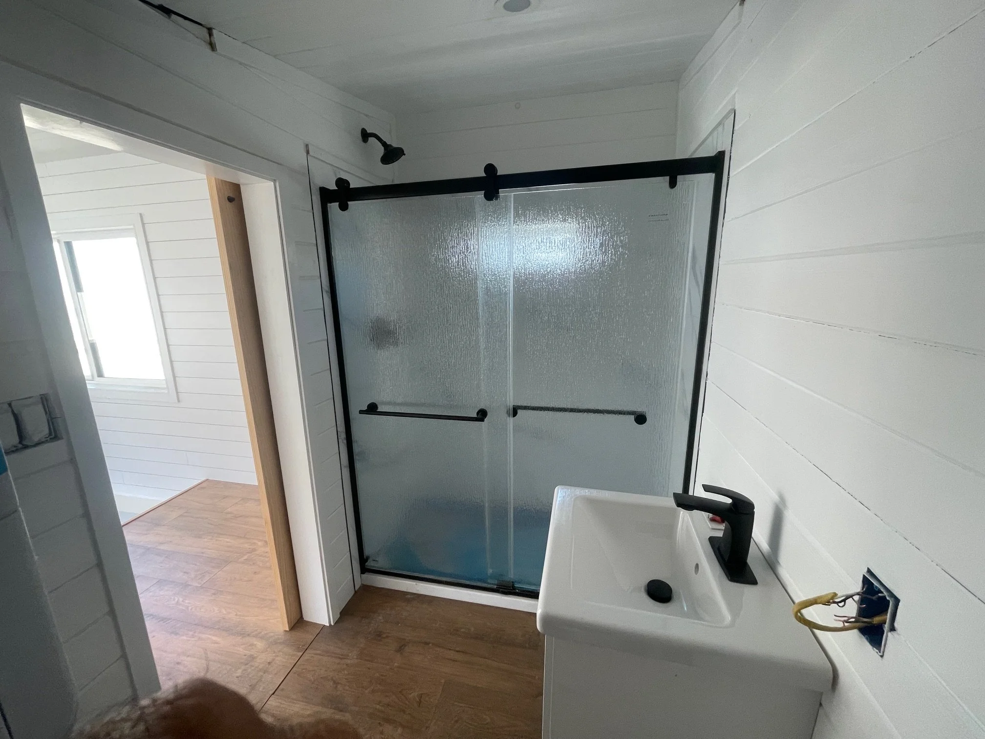 Full 5x3 shower. Bathroom has stylish barndoor.