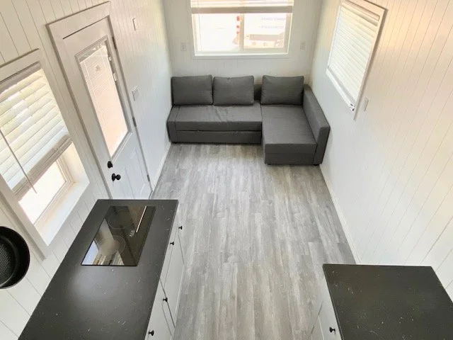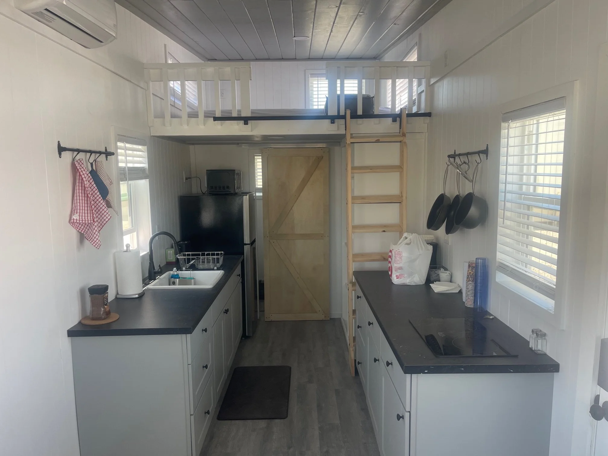 Kitchen w induction cooktop, 2nd loft, couch w pull out bed, stairs as storage.